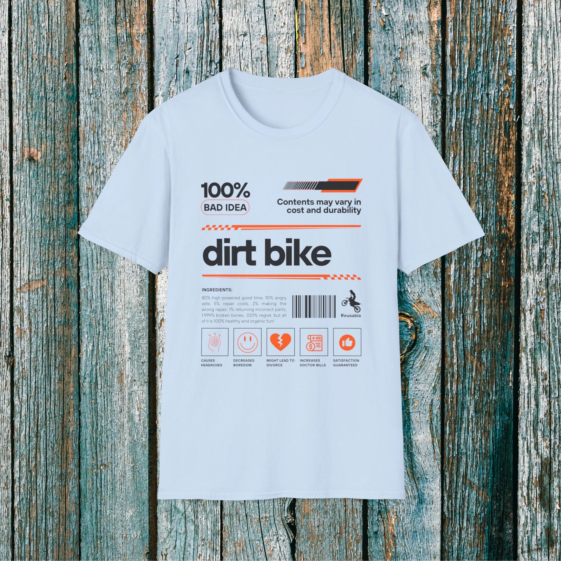Perfect for any occasion, from casual meet-ups to race day gatherings, this shirt will undoubtedly become a go-to in any rider's wardrobe. Celebrate your love for dirt biking with a touch of humor and a lot of style with our "Dirt Bike Ingredients" Tee, because sometimes, the best rides start with a 100% Bad Idea.